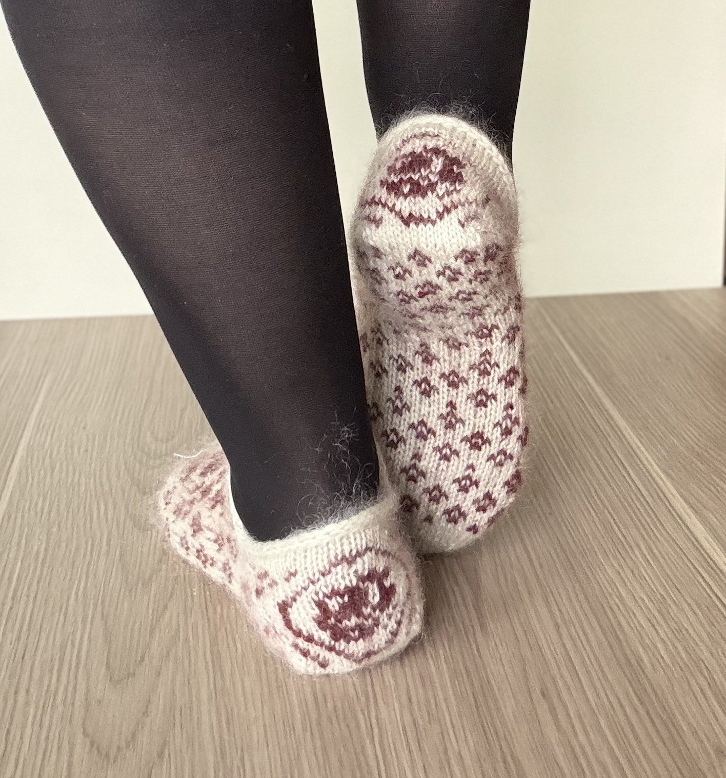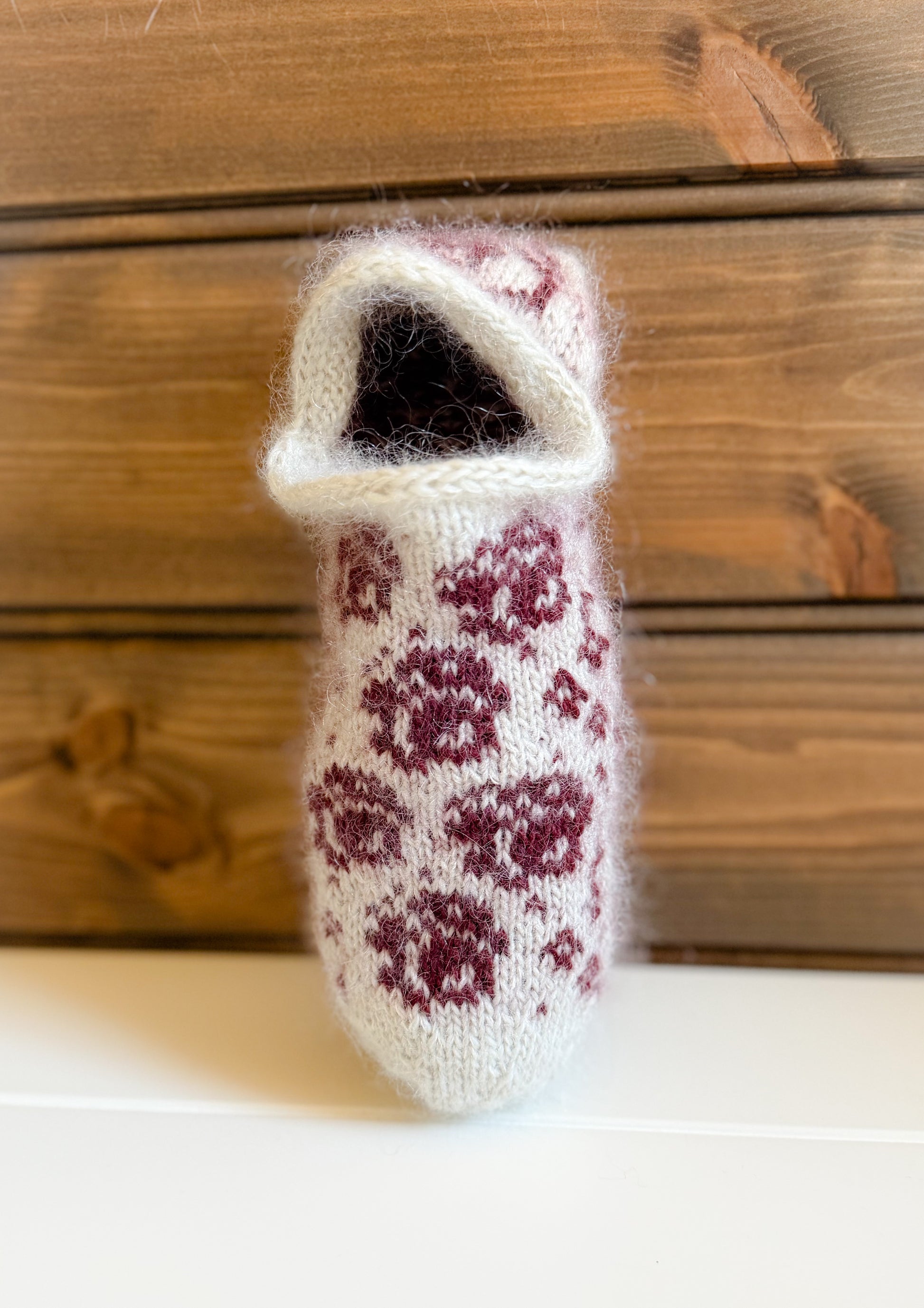 Garnpakke Roser er røde tøfler strikkes i en kombinasjon av Lunt og Lett garn – én tråd av hver garnkvalitet sammen.