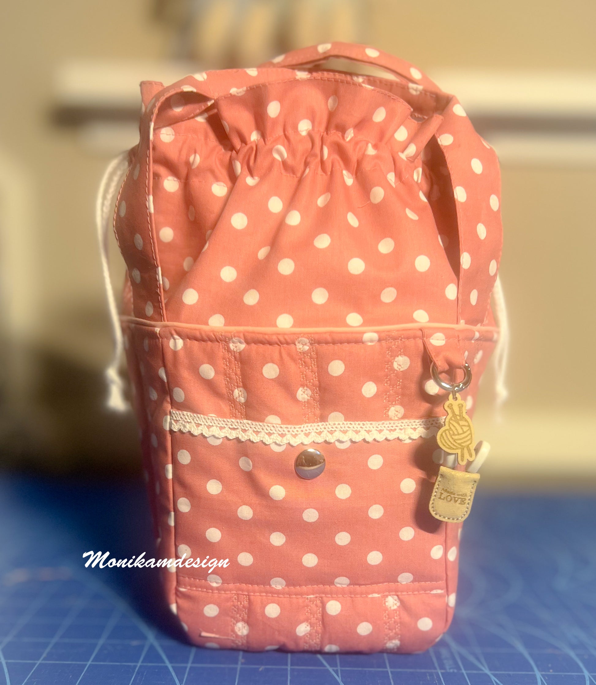 Vesken er sydd i rosa stoff med hvite prikker.