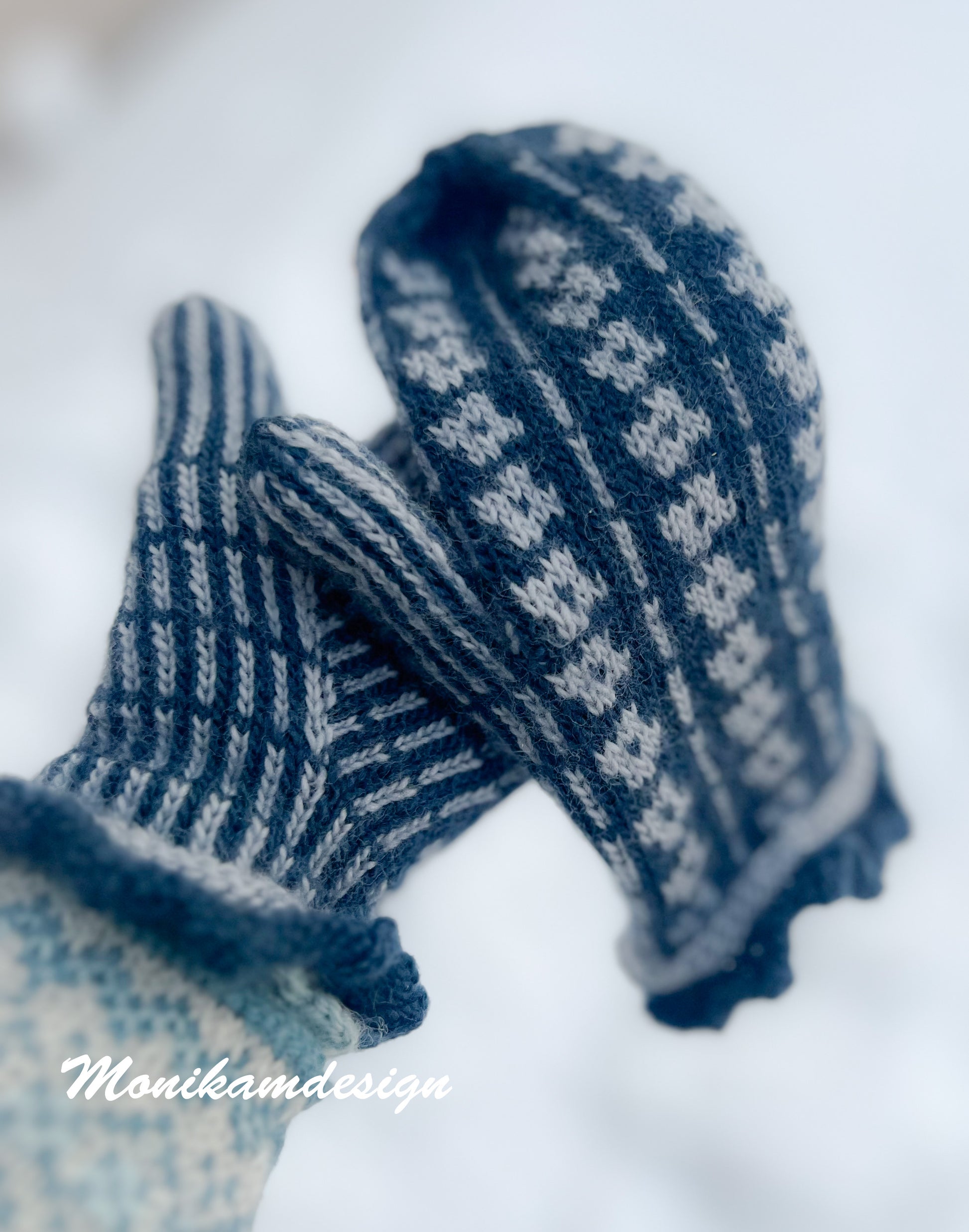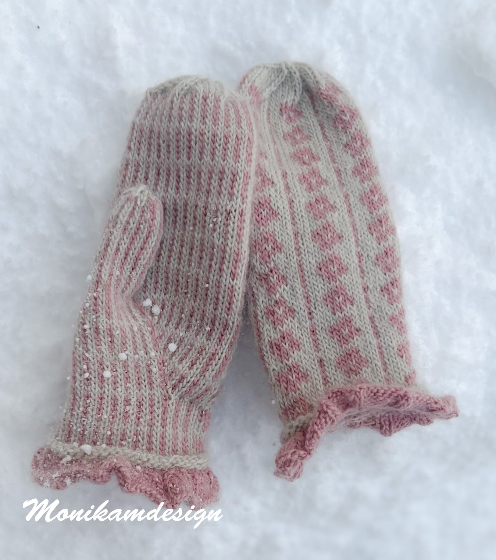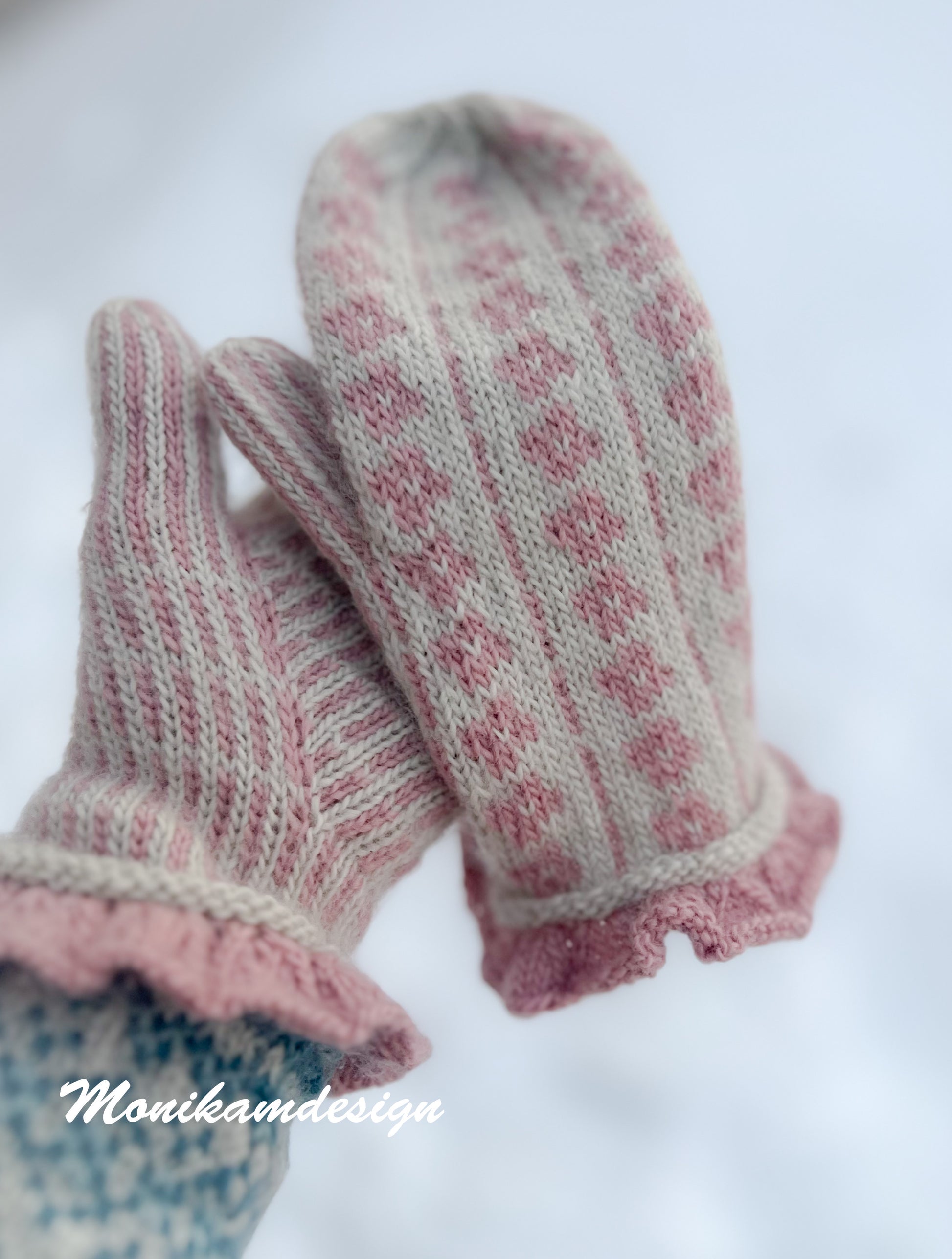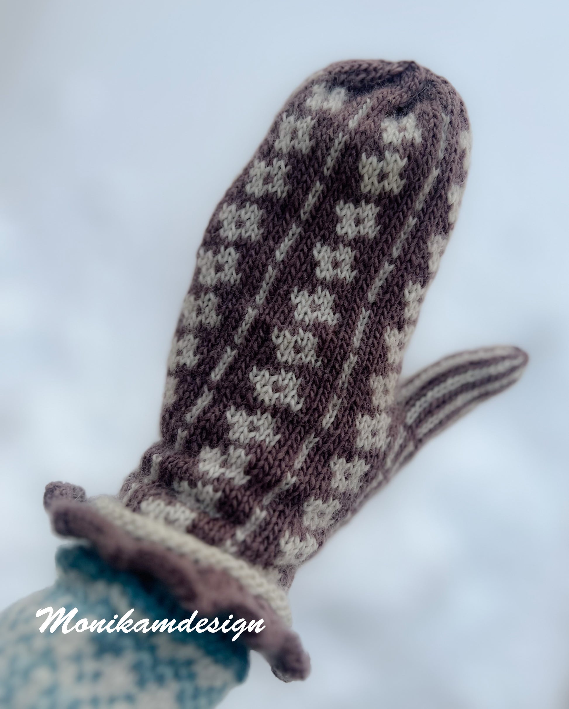 Votten strikkes med en elegant bunnfarge og et vakkert blomstermønster i kontrast. Tommelen er formet som en anatomisk kile som gir ekstra god passform og er enkel å strikke.