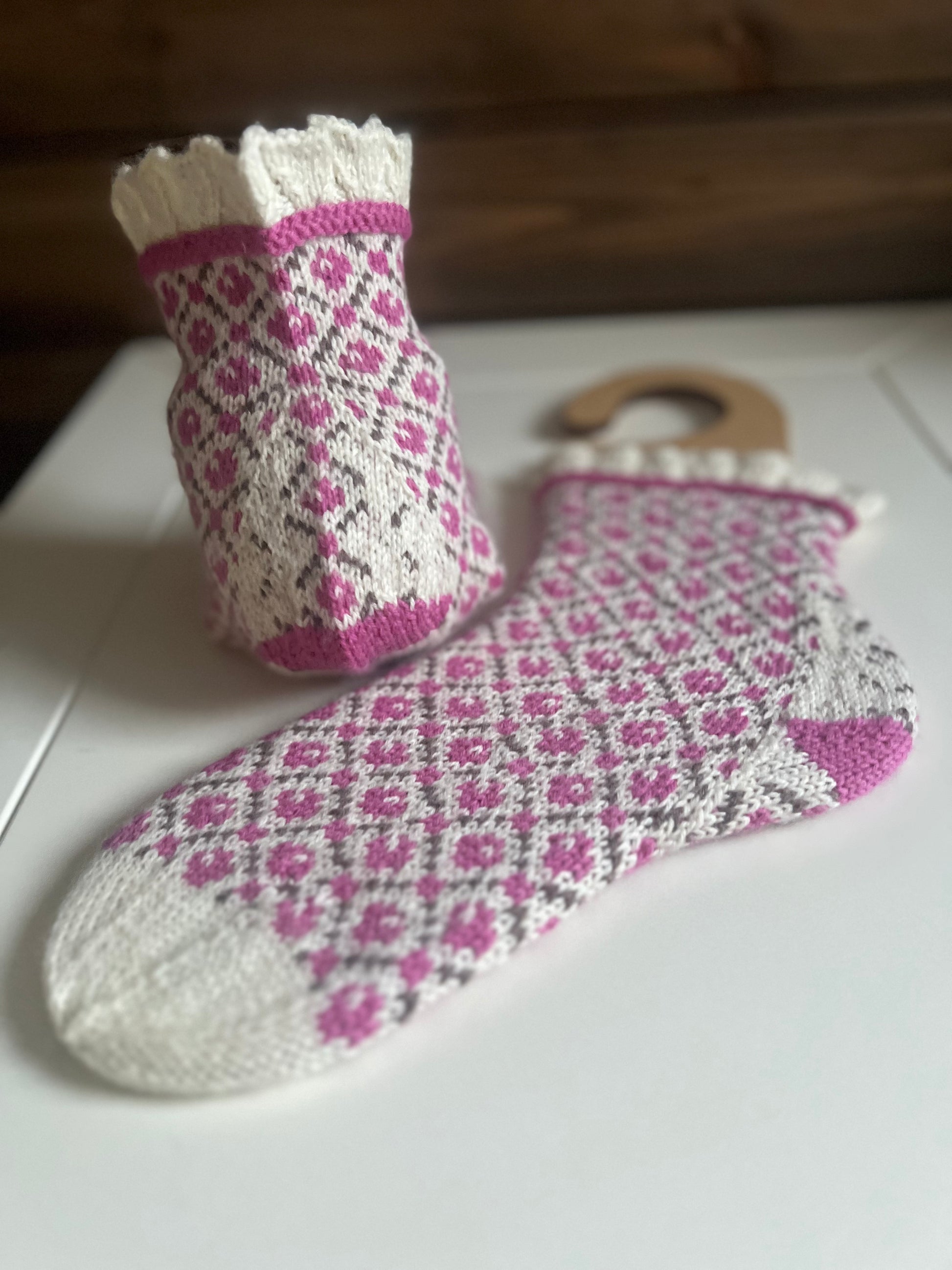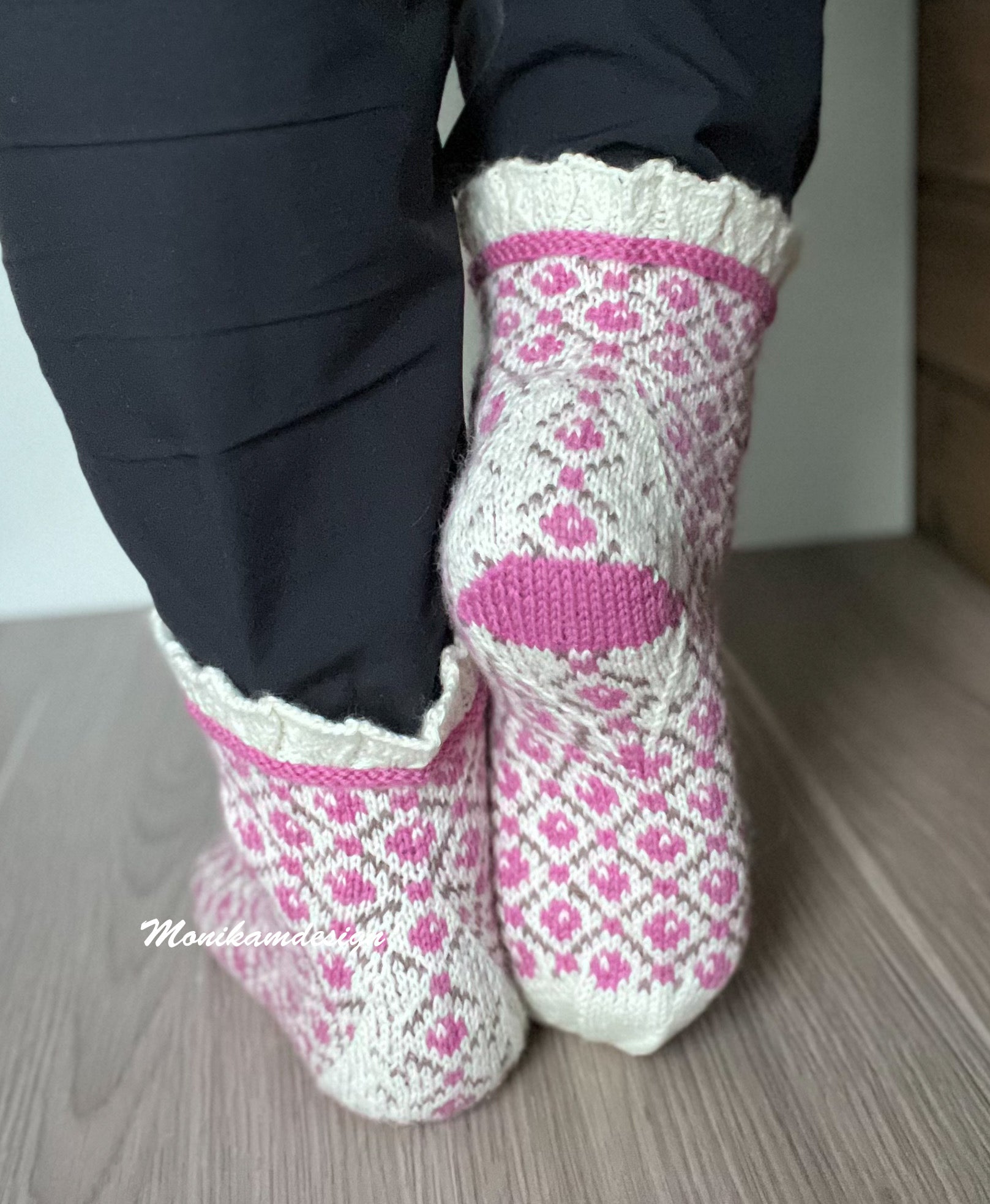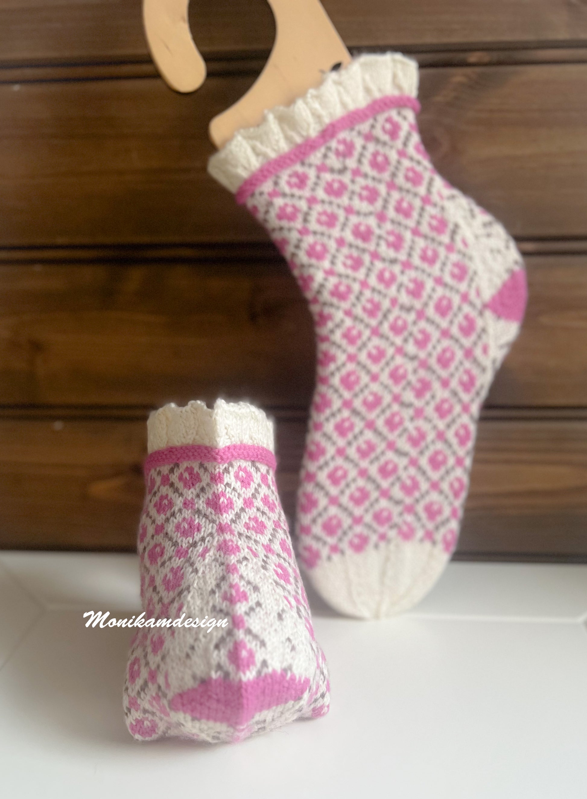 Dette er en romslig sokk. Ønsker du en smalere passform, kan du strikke med pinne nr. 2,5.
