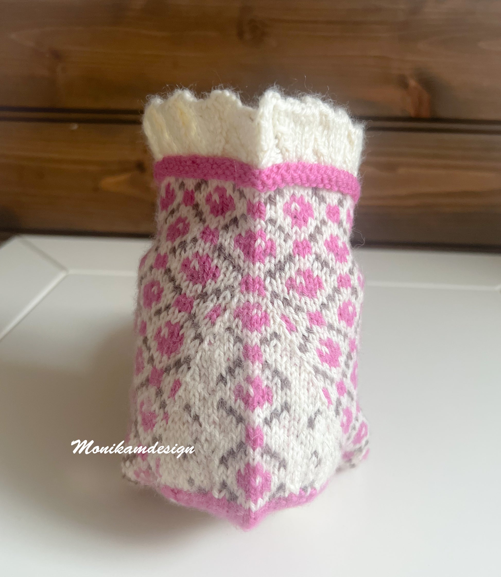 27 masker i mønsterstrikk = 10 cm på pinne nr. 3.