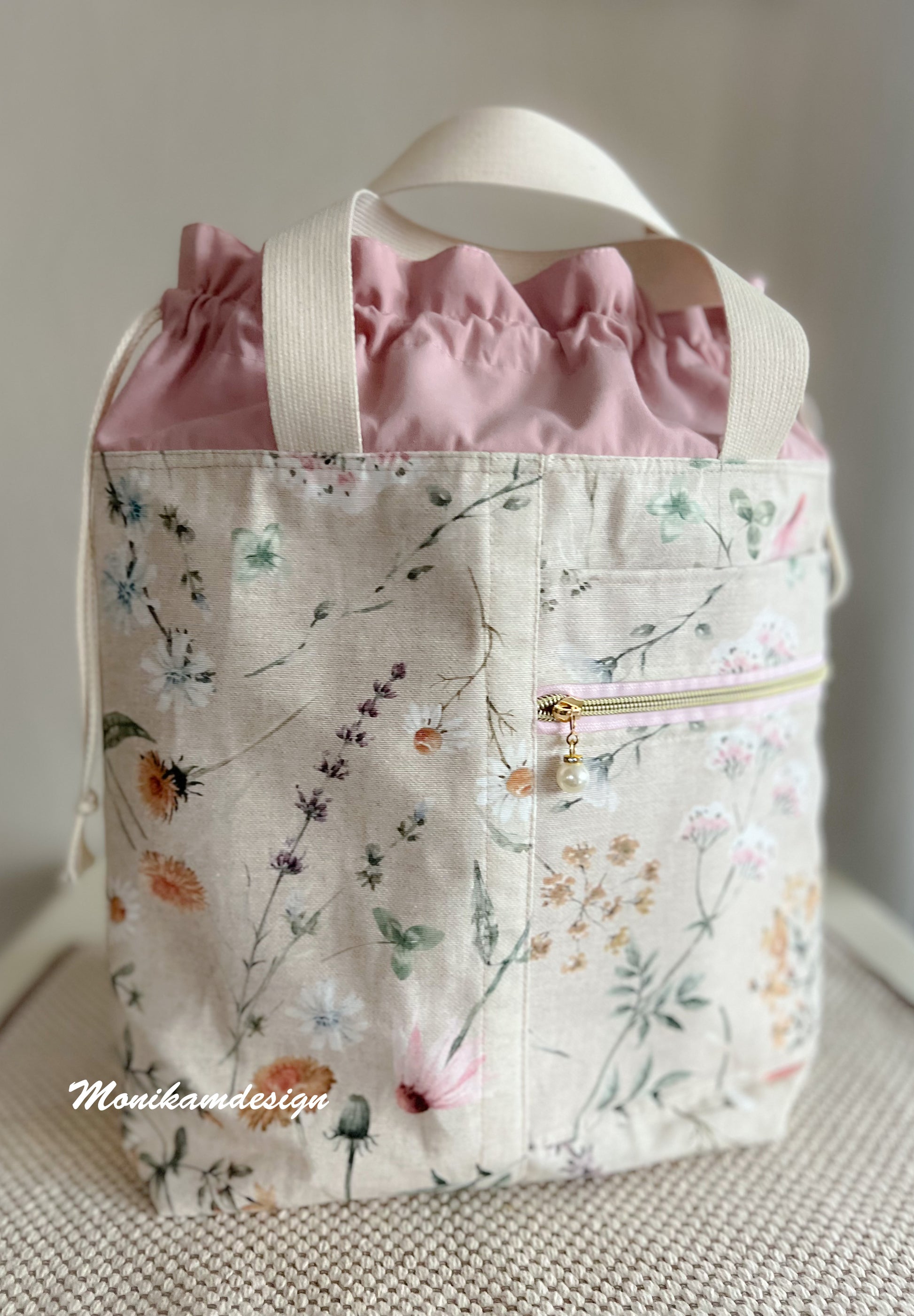 En vakker og praktisk veske sydd i blomstret bomullskanvas med beige bakgrunn.