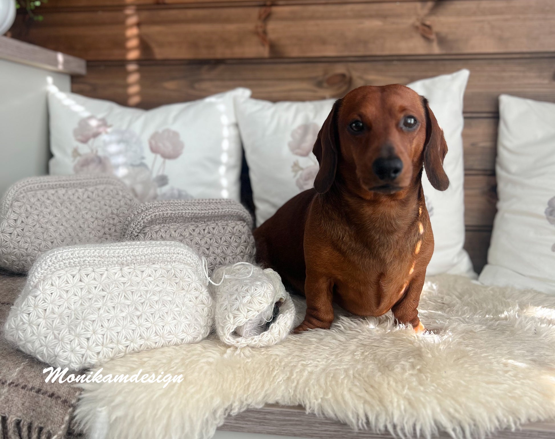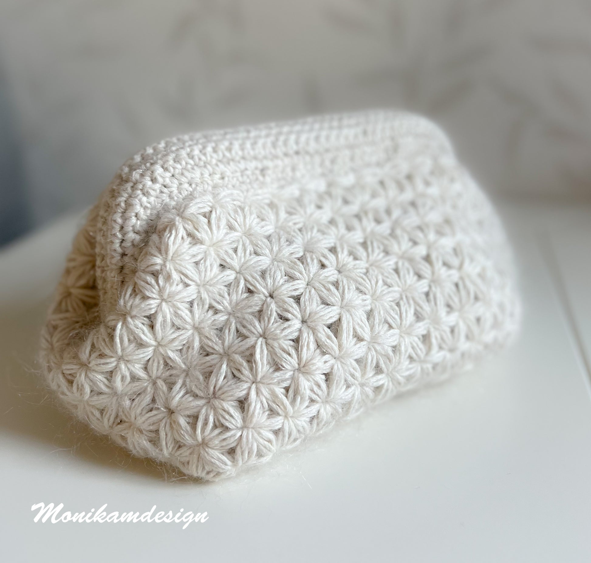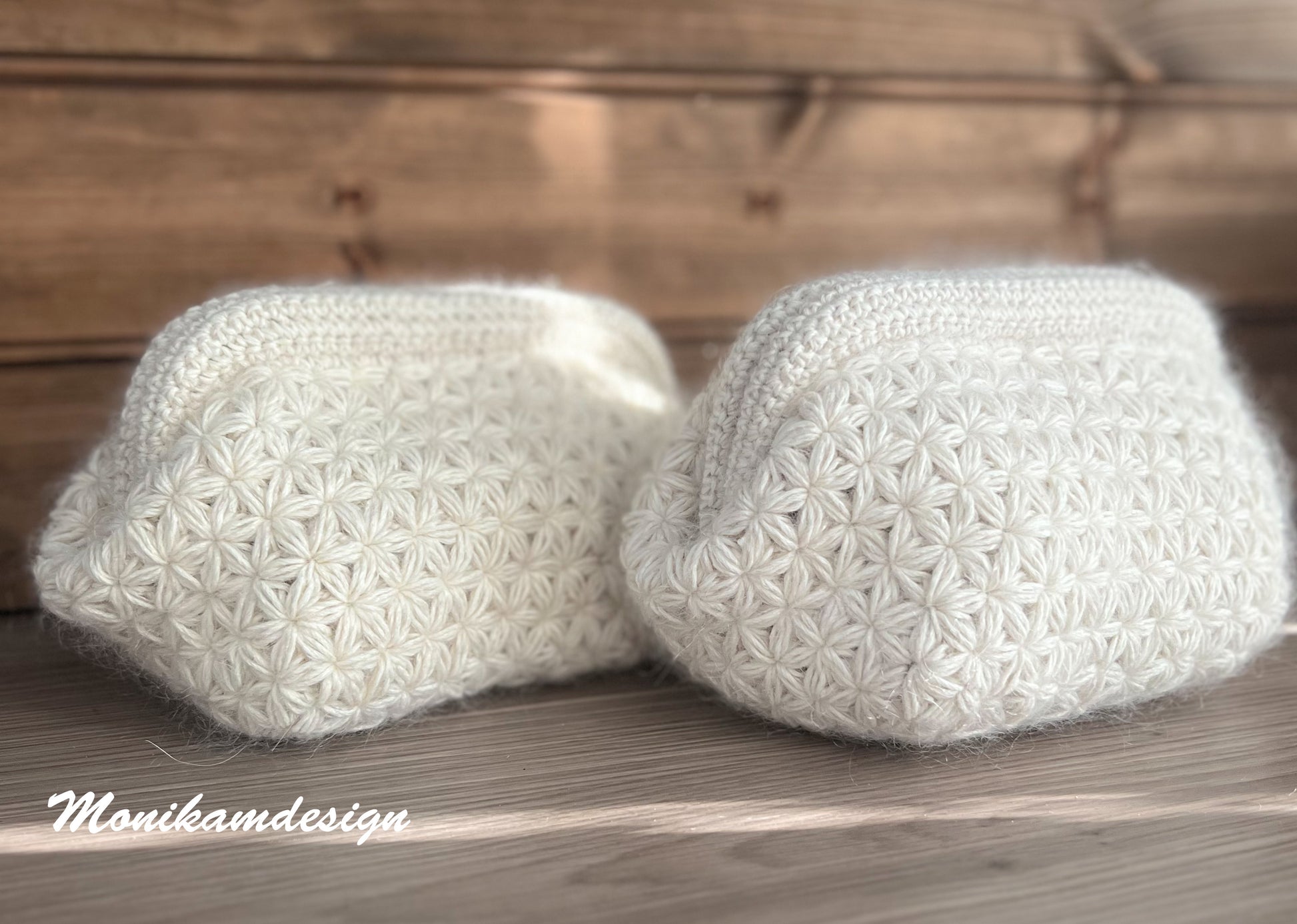 Jasminevesken hekles i det vakre og populære jasminmønsteret, kjent for sitt blomsterpreg og luksuriøse uttrykk. Vesken kan tilpasses alle størrelser veskerammer (20 cm eller større/mindre), og du bestemmer selv ønsket høyde og bredde.